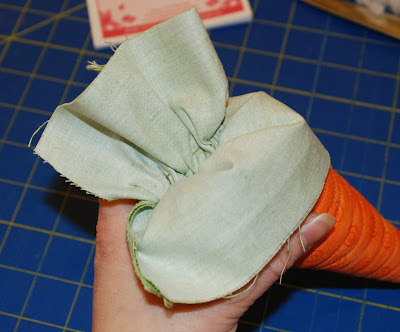 Using a double stranded thread gather the open edge of the carrot and pull opening closed.